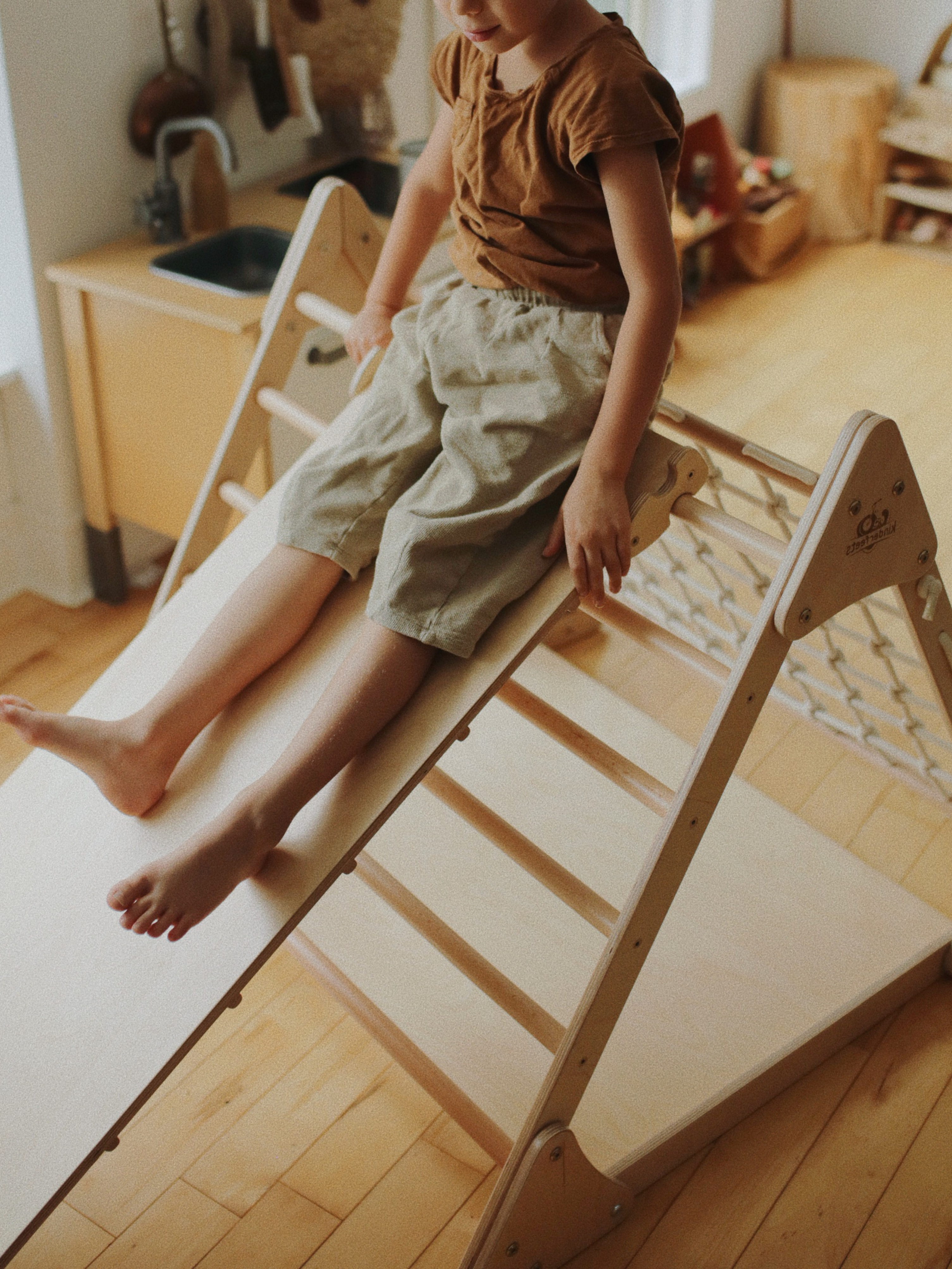ピクラー・トライアングルジム (Lサイズ)は、3つの異なる面で登ることができます:1つはロープ付き、もう1つは木のステッピングブロック、そして3つ目はダウエル(丸棒)で作られた面です。